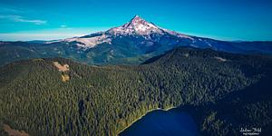 Flying Directly Over Bull Run Lake with Mt Hood Rising in the Distance