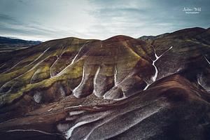 Despite it being a moody morning, the colors on the hillsides of Painted Hills in Eastern Oregon are undeniable and resolute. Salt resembling snow covers the cracks and crevices.